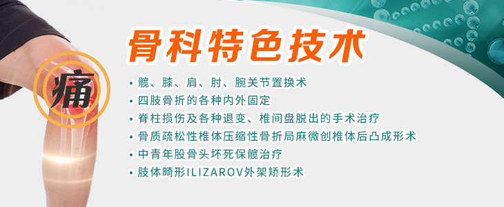 特色技术:1、髋膝关节置换术及快速康复技术2、四肢骨折的各种内外固定3、关节内镜及脊柱内镜技术4、断肢、断指再植术5、中西医结合预防及治疗围手术期并发症...