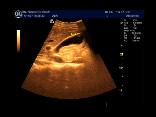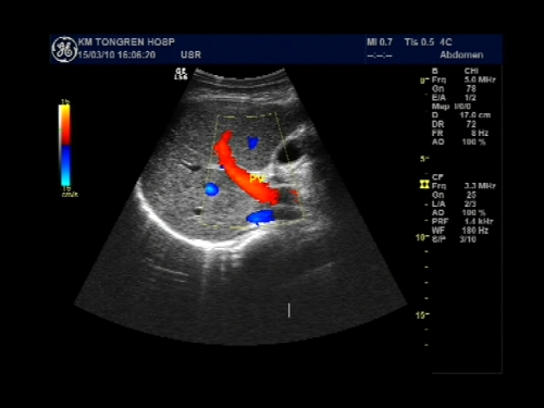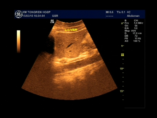 超声声像图能显示肝脏切面形态、大小、肝内实质结构、管道系统及肝周邻,并能根据肝内管道系统区分肝脏各叶、各段,对病变进行定位诊断。彩色多普勒超声能显示肝脏的血流,并能对肝脏的血流动力学参数进行测定,不仅能诊断肝脏的血管病变,还能了解正常肝脏及病变肝脏的血供及回流状态,目前已成为临床诊断肝脏疾病的常规检查方法。