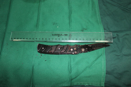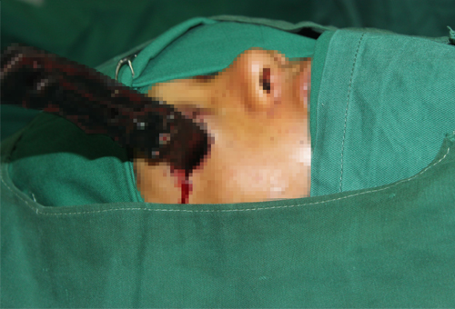 手术按预想的方式进行,进展还算顺利,出血也不多。当陈主任打开上颌窦时,大家都看见了从上颌窦上壁到后壁斜行向后穿过的一把冷冷的刀,大家不停唏嘘着:为何凶手如此狠毒。接下来就是口腔颌面外科的袁会诚主任上阵拔刀,奈何这刀插得太深,完全是镶嵌到骨缝里的,又不能摇晃,怕增加新的损伤,想拔出来确实不容易。后来三位专家齐上阵,陈主任、殷主任固定头部,袁主任拔刀。终于,刀出来了。鼻内窥镜检查见翼腭窝处有动脉搏动性出血,用电凝止血。血止住了,大家都松了口气。然后就是冲洗伤口、缝合伤口、鼻腔填塞等处理。术后因为我们终于完成了这样一台奇特的手术,挽救了一个生命,如释重负。