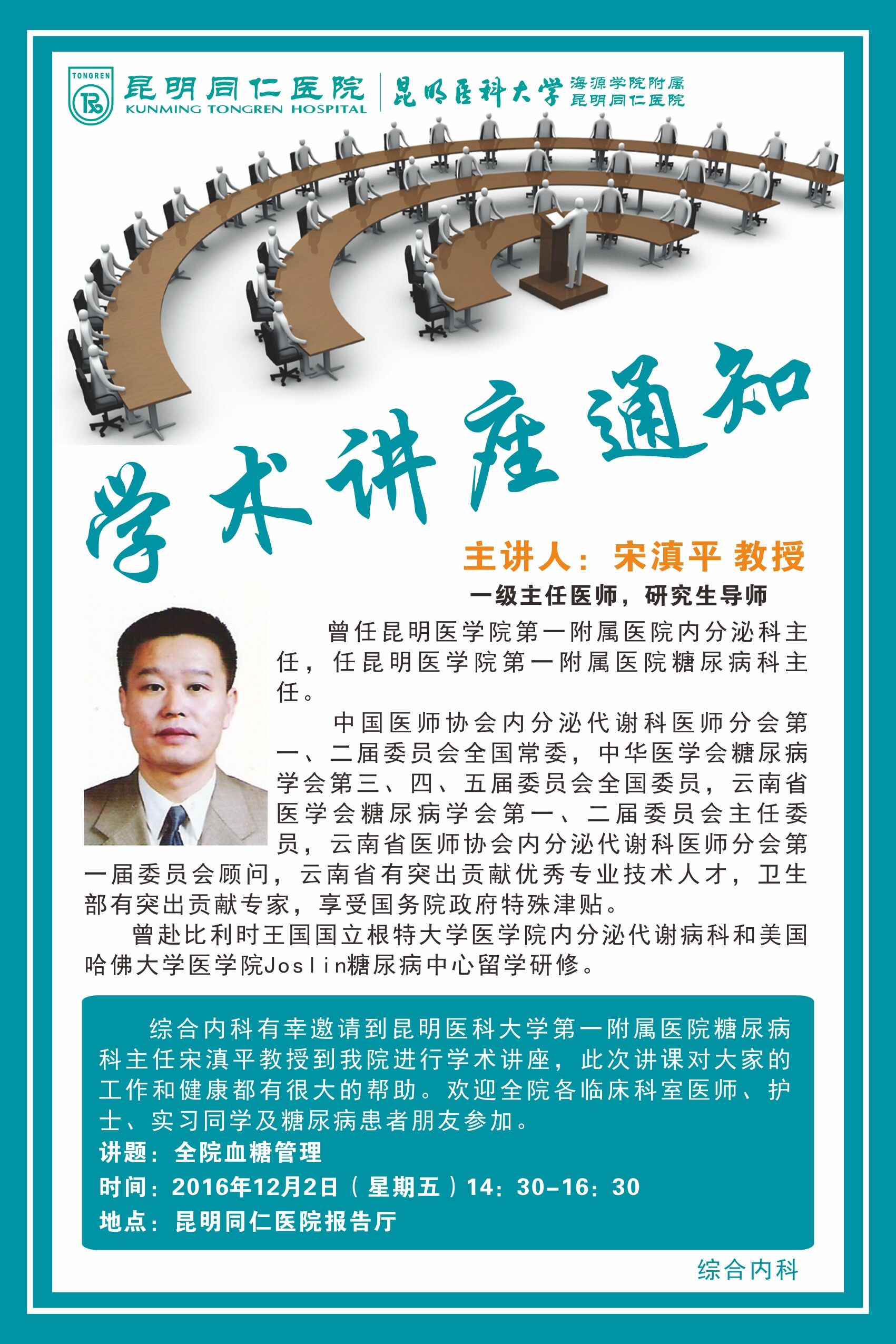 为了让更多患者更好地认识糖尿病和管理自己的血糖。色漫网 特邀昆明医学院第一附属医院糖尿病科主任:宋滇平,于12月2日到我院举行《全院血糖管理》学术讲座。欢迎各位患者及医护人员积极参与、学习。