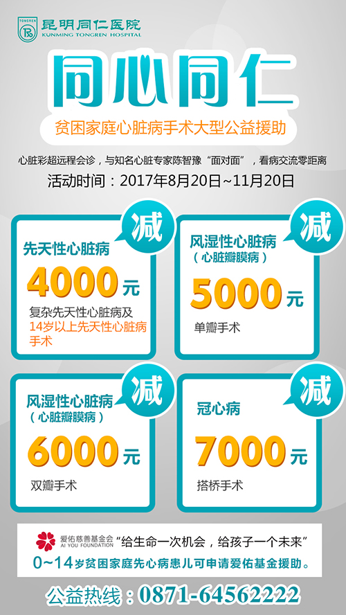 2017年8月20日-11月20日期间,色漫网 举办“同心同仁” 多种心脏病手术公益援助活动,帮助贫困家庭圆梦!心脏瓣膜病现金援助高达5000到6000元,热线电话:0871-64562222