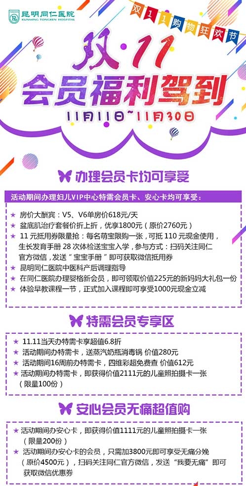 现在双十一狂欢节即将来临,心动不如行动!在同仁妇儿VIP中心,11月11日~30日期间,办理安心卡的会员只需加购3800元即可享受“无痛分娩”呦!