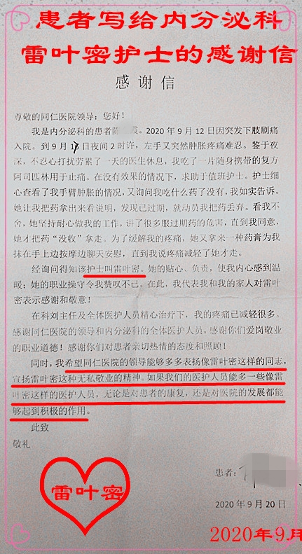 恭喜肾脏内分泌科美小护雷叶密斩获了患者及其家属的心爱心、耐心、细心、热心你全体都有雷叶密再接再厉,继续散发你的光和热温暖患者的心肾脏内分泌科护理团队加油!