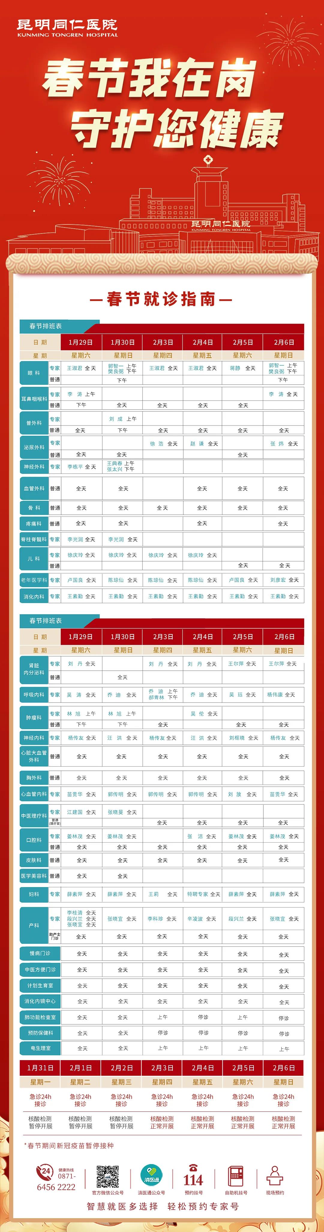 注:出诊专家如有临时变动以当天实际坐诊为准。 健康热线:0871-64562222。 1月31日(除夕)、2月1日(初一)、2月2日(初二)门诊停诊,2月3日(初三)起门诊恢复接诊。 1月30日——2月9日,健康管理中心暂停接检,2月10日起恢复接检。