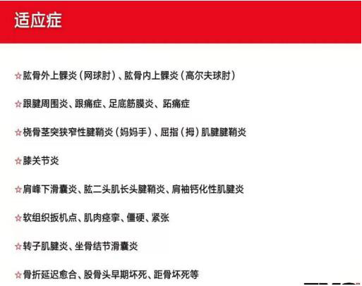 主要机制:促进血液流动,减少肌肉紧张,抑制肌痉挛,加速清除P物质等疼痛介质;加速胶原蛋白产生,刺激微循环(血液、淋巴),改善新陈代谢,激活机体自我修复能力;加速钙化纤维细胞的溶解和脱钙;耗竭C纤维中P物质,提高疼痛阈值。