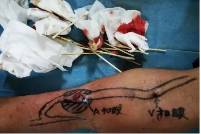(2)AVF在应用穿刺后感染比较少见,多为扣眼穿刺法后的隧道感染,其表现为局部分泌物增多、红肿、疼痛甚至脓液流出、止血困难等。此时,需要尽早的诊断治疗。