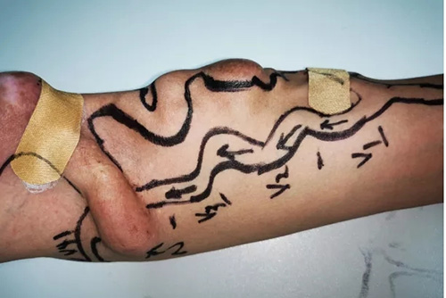高位内瘘合并头静脉弓闭塞,前臂血管迂曲扩张▲