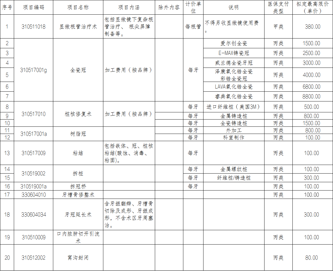 根据《云南省医疗保障局关于实行市场调节价部分医疗服务项目医保支付有关问题的通知》(云医保【2020】90号】),为促进口腔业务的拓展,满足患者多元化口腔治疗需求,我院本着公平、合法和诚实信用的原则,根据业务开展的需求对部分医疗服务项目价格进行自主定价,并在执行前一周进行公示,现将项目名称及价格公示如下: