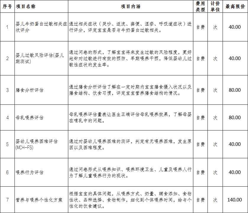 根据医院业务发展需求,我院儿童健康管理中心开设(喂养门诊),主要针对婴幼儿喂养问题提出建议。因此我院本着公平、合法和诚实信用的原则,根据业务开展的需求新增相关医疗服务项目价格,并在执行前一周进行公示,现将项目名称及价格公示如下: