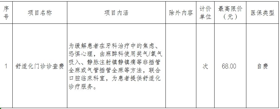 根据医院业务发展及满足患者多元化诊疗需求,让患者在安全,无痛苦、舒适的状态下接受检查治疗,我院本着公平、合法和诚实信用的原则,依据项目成本,新增舒适化门诊医疗服务项目,并在执行前一周进行公示,现将项目名称及价格公示如下: