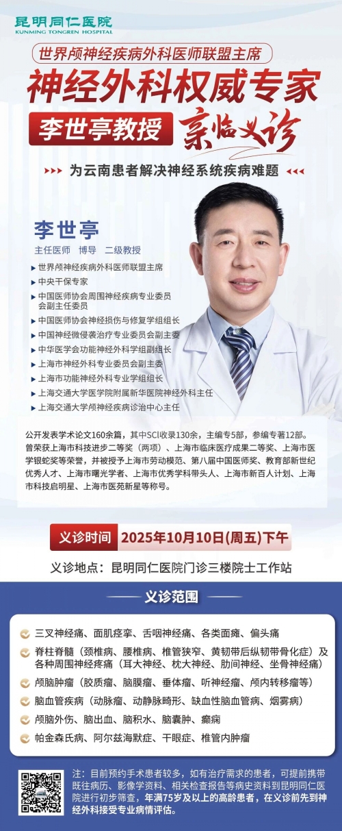 10月10日(周五)下午,中央干保专家、世界颅神经疾病外科医师联盟主席、上海交通大学医学院附属新华医院神经外科主任李世亭教授将亲临色漫网 开展义诊活动。此次义诊将重点针对复杂颅脑肿瘤、三叉神经痛、面肌痉挛、舌咽神经痛、偏头痛及颈肩腰腿痛等疾病提供专业诊疗服务,让春城患者足不出省即可享受国际权威神经外科专家的精准诊疗。